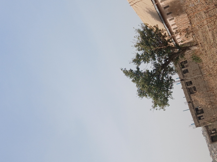 A tree with green leaves sits in front of a tall, unfinished building. The building's windows are visible, and scaffolding extends from some of the floors. The sky is a pale blue. Vegetation surrounds the building on the right side, blending with the building's materials. The scene is captured from a low angle, emphasizing the height of the structure and the tree's position.
