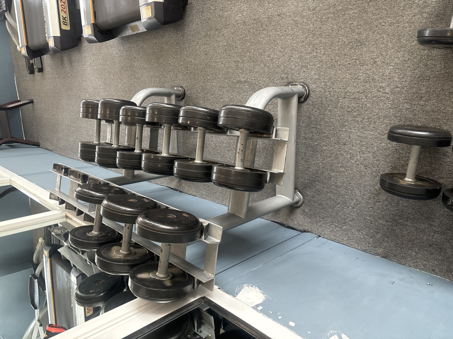 A gray, textured wall serves as the backdrop for a gym scene. Two rows of dumbbells, arranged on a metallic rack, dominate the image. Each dumbbell has a dark, round weight on either side of a gray handle. A treadmill is situated in the top left corner. Additional dumbbells are sparsely arranged on the right side of the image, seemingly floating on the gray wall. The scene gives a sense of being in a gym, with the wall-mounted setup contributing to an efficient use of space.