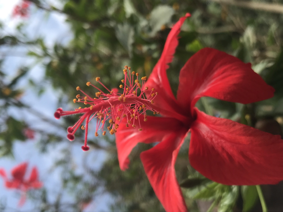 The image presents a close-up, shallow-depth-of-field photograph of a vibrant red hibiscus flower in an outdoor environment within the city of Jos, Nigeria. The flower, centrally positioned, features five distinct, open red petals with a smooth texture. A prominent red stamen column extends vertically from the flower's center, adorned with numerous short filaments tipped with small, yellow anthers. At the column's apex are five dark red, fuzzy stigmas. The background is significantly blurred, displaying indistinct green foliage, several out-of-focus red floral shapes, and patches of light blue sky. The scene is illuminated by natural light. No individuals or man-made objects are discernible beyond the botanical subjects.