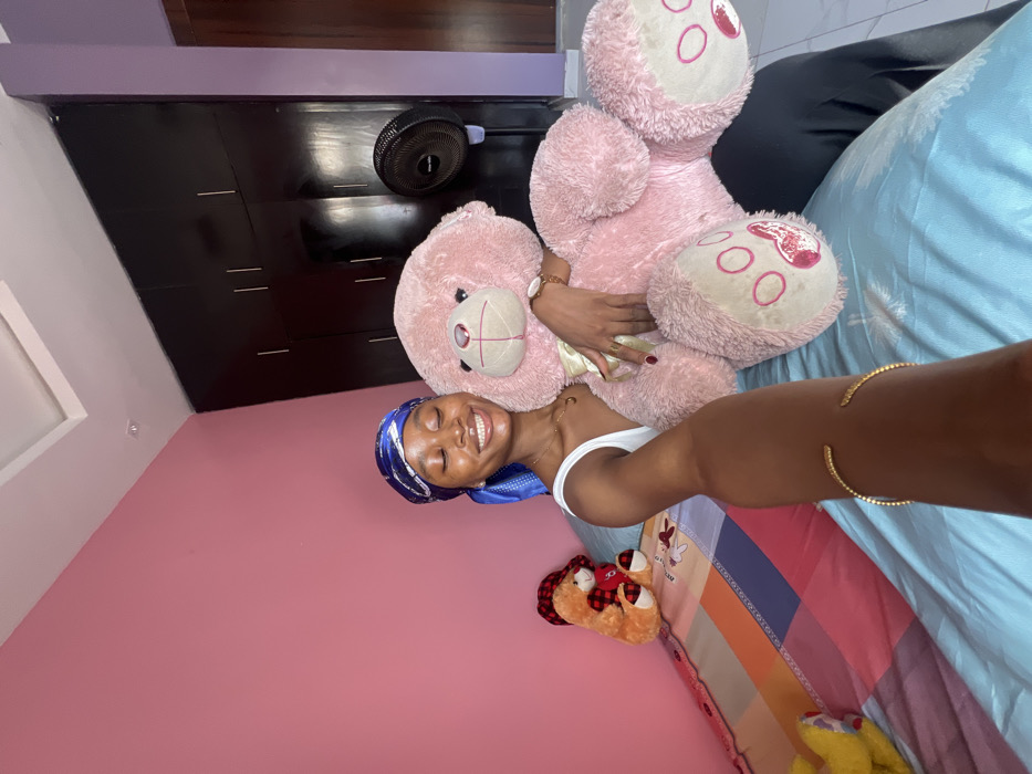 A young Black female is depicted in a brightly lit room, likely a bedroom. The subject, with dark skin, closed eyes, and a wide smile revealing dental braces, wears a blue patterned headwrap and a white sleeveless top. She holds a large, pink plush teddy bear with a light-colored snout and a ribbon around its neck. Her right arm is extended towards the camera, with a gold-colored arm cuff visible on her upper arm. A gold necklace is present around her neck, and a watch is on her left wrist. The background features a pink wall on the left and a darker wall or wardrobe unit to the right, along with a black stand fan. On a bed to the left, covered with light blue and multi-striped bedding, a smaller brown teddy bear wearing a red plaid hat and holding a red heart is visible, alongside a partial yellow plush object. The specific location within Odo Ogun, Nigeria, cannot be determined from the visual information provided.