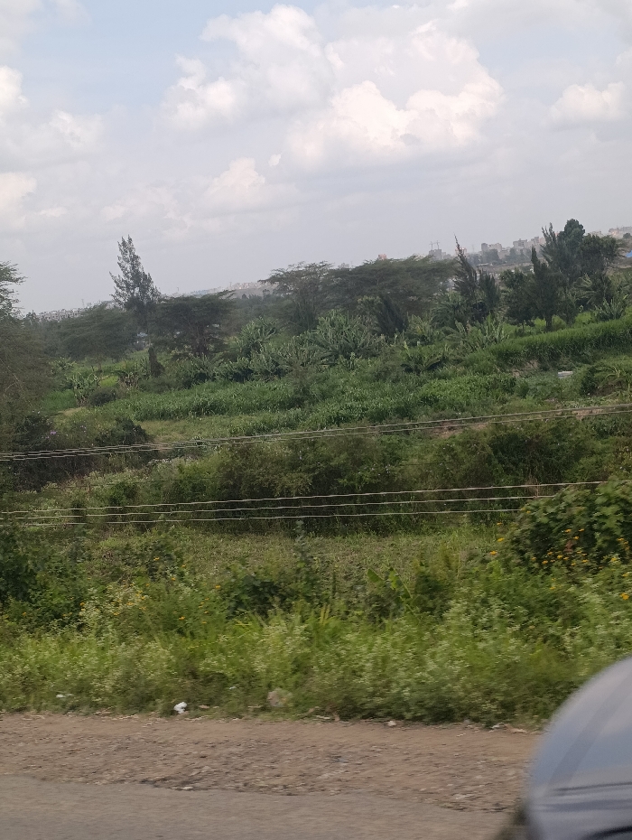 The image depicts a verdant landscape in Matungulu west ward, Kenya, under an overcast sky with scattered white clouds. The foreground shows a dirt and gravel road surface, with a dark grey vehicle component partially visible in the bottom right. The midground features dense green vegetation, including shrubs and taller trees, with several horizontal utility lines running across. An upward sloping terrain, heavily covered in lush green growth and interspersed with trees of various species, dominates the scene. In the distant background, at a higher elevation, several structures and buildings are visible, indicating urban or semi-urban development. No individuals are present in the scene.