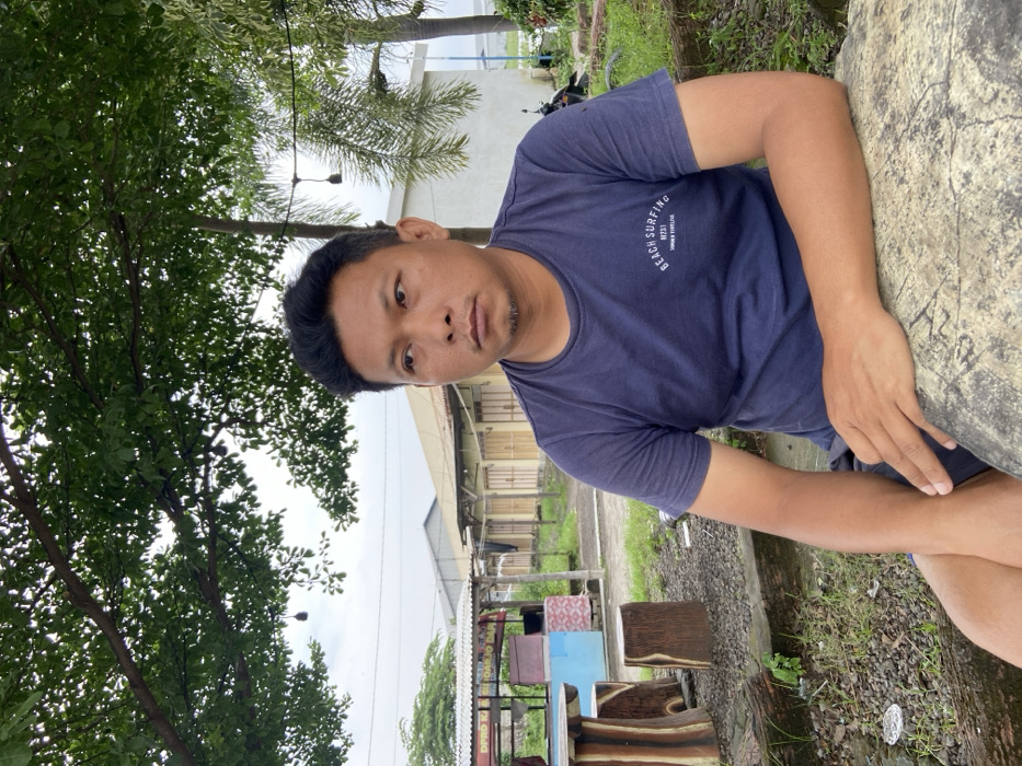 An adult male, appearing to be of Southeast Asian ethnicity, is seated outdoors in Kalitengah, Indonesia
