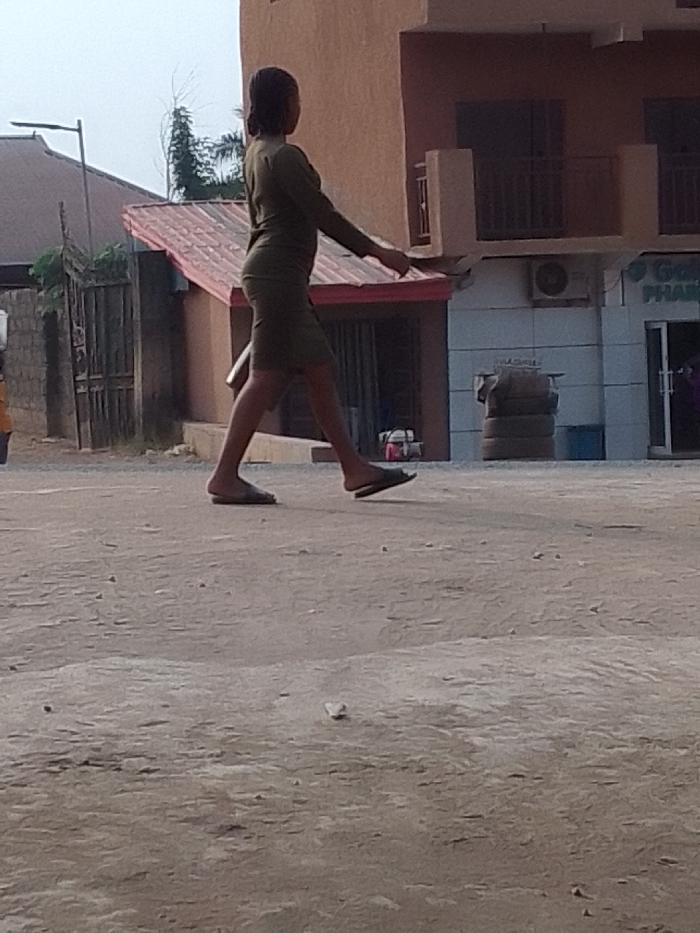 The image depicts an outdoor urban scene in Nkwelle Ezunaka, Nigeria. A female individual, dressed in an olive green, long-sleeved, knee-length dress and dark slip-on sandals, is captured mid-stride, walking from left to right across a light brown, unpaved dirt surface. Her right foot is lifted, while her left foot is planted. She carries an indistinct light-colored object in her right hand. In the left background, a structure with a reddish-brown corrugated metal roof is visible, behind which are a dark metal gate and a street light pole. Sparse tree branches extend above the roofline. The right background features a multi-story building with a light brown facade. The ground floor displays a commercial storefront with a partially visible sign reading "GOO PHA," indicative of a pharmacy. An external air conditioning unit is mounted on the wall. A stack of four dark, worn tires rests on the ground near the building, alongside a small red and white object. A dark-colored balcony with railings is present on an upper floor. The sky is uniformly light gray, suggesting an overcast condition.
