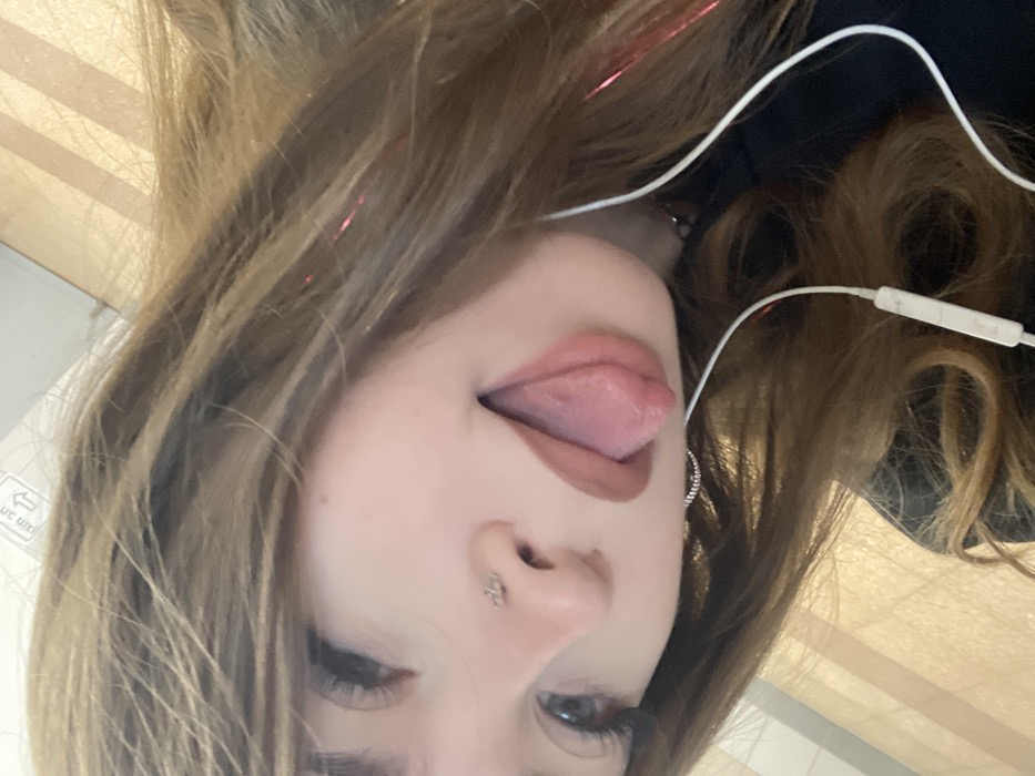 A woman with light brown hair, adorned with a few pink hair tinsel strands, sticks her tongue out. She has a nose piercing and an earring, visible from the side. A white earbud cord partially obscures her face. She has grey eyes and wears light brown lipstick. The background is out of focus, showing hints of a wooden surface and a directional sign. The image is presented in a vertical format.
