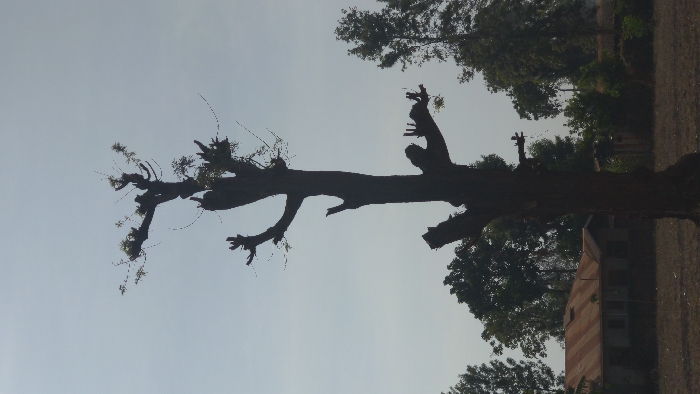 A silhouette of a gnarled tree dominates the frame against a light blue sky. The tree's bare branches reach out like skeletal fingers, some with sparse greenery. Behind the tree, glimpses of other trees and foliage add depth to the scene. A structure, possibly a building, is visible on the right, adding an element of human presence to the natural setting. The image appears to have a slightly rotated orientation.