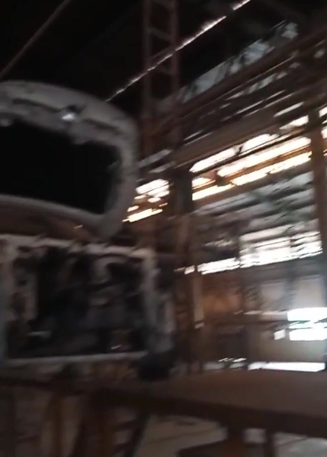 white car body on a metal frame, raised in what appears to be a factory or warehouse. The car's hood is open, revealing the engine compartment. The environment is dimly lit with a high ceiling and visible support beams. No people are visible in the frame. The camera angle is low, looking up at the car body.