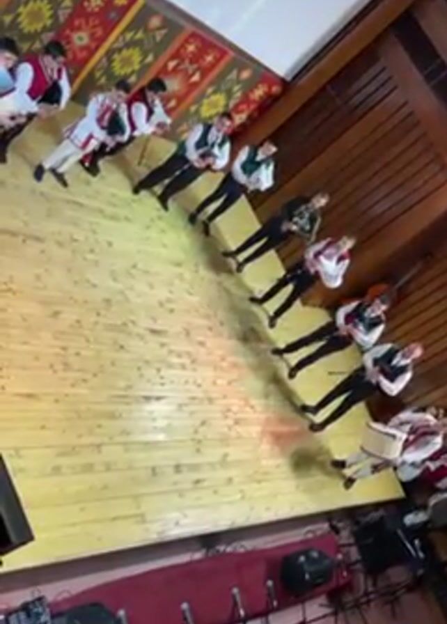 A tilted wide shot shows a group of men in traditional outfits playing instruments on a wooden stage. The men are dressed in combinations of white shirts, green or red vests, and black pants. They are arranged in a line, playing instruments including an accordion, a drum, and stringed instruments resembling violins. Microphones are set up along the edge of the stage, and a patterned rug hangs on the wall in the background. The room has wood-paneled walls and ceiling.