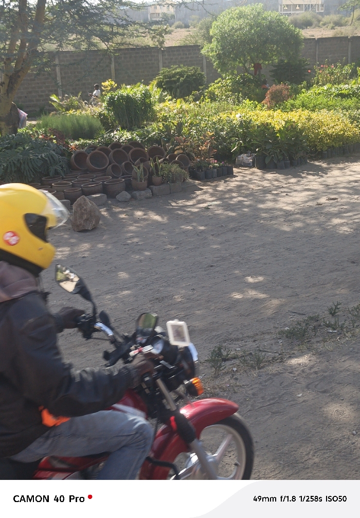 A red motorcycle with a rider wearing a yellow helmet passes by a plant nursery. Clay pots, plants in black plastic bags, and various trees and shrubs are displayed behind a low brick wall. Sunlight filters through the trees, casting shadows on the dusty ground. A building can be seen in the background.