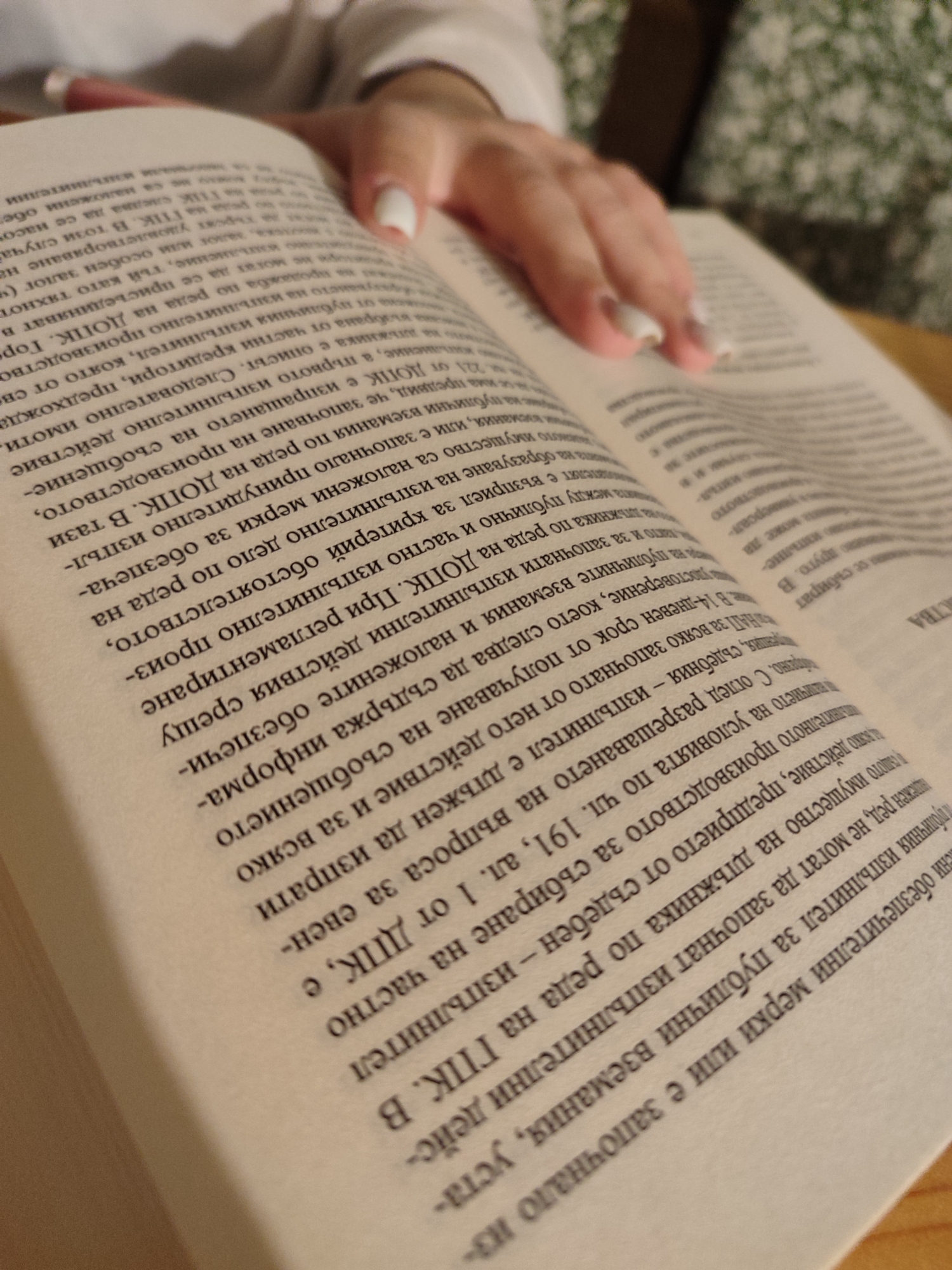 n open book held by a person's hands, presumably indoors. The book is printed with text in what appears to be Bulgarian, judging by the Cyrillic script. The text seems dense, likely from a legal or academic text. The person's fingers are visible, and they have white nail polish. The book is close to the camera, and the background is blurred, suggesting a shallow depth of field. There are no specific details indicating the location in the city of Varshilo, Bulgaria.