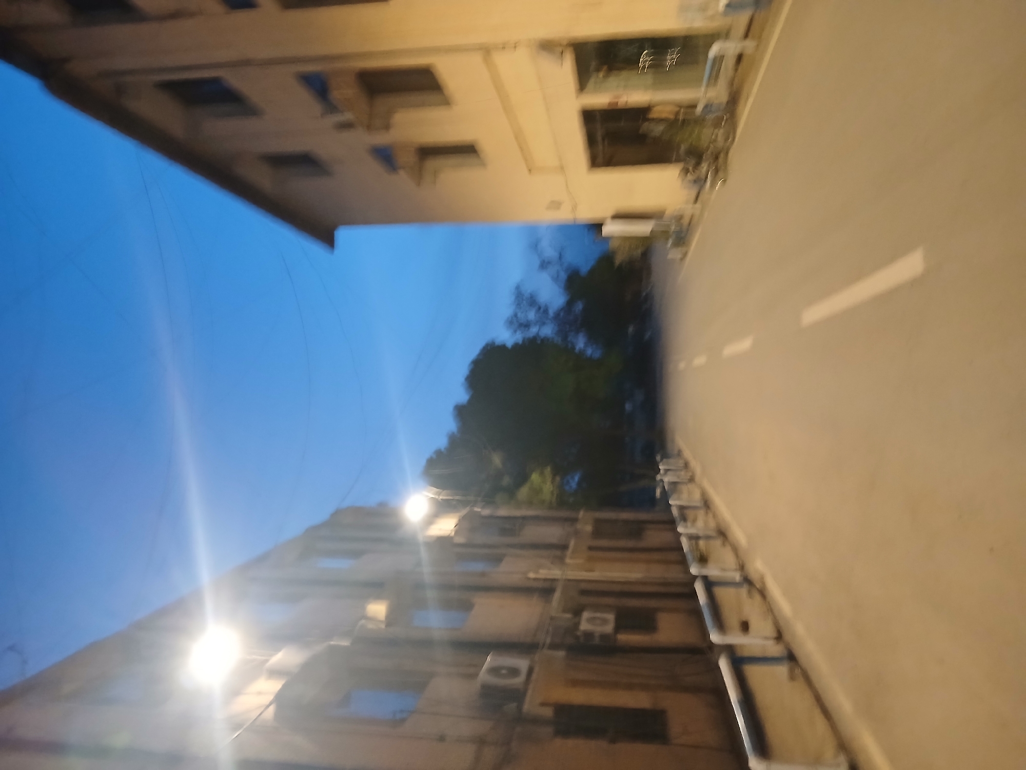 The image depicts a street scene in Quetta City Tehsil, Pakistan, at twilight or dawn. The street is flanked by buildings on both sides. The building on the left appears to have multiple stories with windows and what appears to be air conditioning units on its facade. The building on the right also has multiple stories with windows and balconies. Overhead, the sky is a deep blue. The street is paved and has a dashed white line indicating traffic lanes. Streetlights illuminate the scene. There are trees visible between the buildings. There are no people visible in the image.