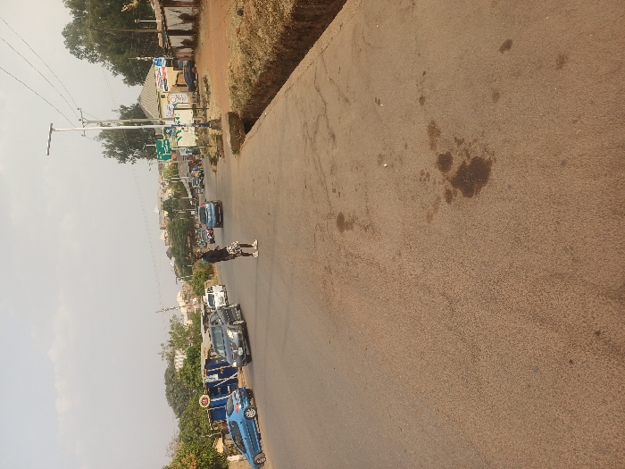 The scene depicts a street in Jos, Nigeria, under an overcast or hazy sky. A single individual stands centrally in the left lane of the asphalt road, facing away from the camera and towards the left. The person wears a dark long-sleeved shirt, patterned shorts, and white sneakers. Vehicular traffic is present: a blue Peugeot 206 hatchback is parked or stationary on the left shoulder, facing the camera, while a dark grey SUV is in motion towards the camera in the left lane. Additional vehicles are visible further down the road, indicating moderate traffic. The road surface is worn, featuring several dark liquid stains, consistent with oil, in the foreground. To the right, an exposed dirt shoulder borders an open concrete drainage ditch. Beyond the ditch, a utility pole with power lines and a solar-powered street light is visible, alongside various buildings, some with corrugated metal roofs, and sparse vegetation. The left side of the road features additional structures, likely commercial, intermingled with trees and dense foliage. Hilly terrain and more buildings are visible in the distant background.