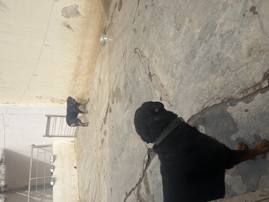 The scene depicts an outdoor concrete paved yard or courtyard in Giginyu, Nigeria. Two Rottweiler dogs are present. One dog, wearing a dark collar, is in the foreground, positioned with its back to the viewer, facing right. Its head and upper torso are visible. The second Rottweiler, also dark-coated with tan markings, is in the mid-ground, walking from left to right across the concrete. This dog wears a dark collar and appears to be looking towards the left side of the frame. The ground is concrete, extensively cracked, with numerous dark stains consistent with water or dirt. To the left, a light-colored wall features a silver metal railing and three empty stainless steel dog bowls placed on the ground below the railing. To the right, a textured, lighter brown wall shows signs of wear and damage, including peeling paint and a small silver spigot approximately halfway up the wall. A single stainless steel dog bowl rests on the concrete floor near this wall. In the background, between the two dogs, a standalone metal rack or gate is visible near the left wall. The environment is brightly lit by direct sunlight, casting distinct shadows. No humans are visible.