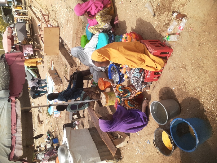 The scene depicts an outdoor, informal market located in Bauchi, Nigeria. The ground is unpaved, consisting of packed dirt and sand. Bright daylight illuminates the area, casting clear shadows. In the immediate foreground, a cluster of vendors is visible. Two women are seated directly on the ground; one wears a purple hijab and a multi-colored patterned dress, the other an orange head covering and a patterned dress, positioned on a red plastic crate. Between them, a child is partially visible. Surrounding these individuals are multiple plastic buckets of varying colors (blue, black, grey, orange) containing substances such as a yellow granular material and clear liquid. Several empty plastic bottles are scattered on the ground nearby. Slightly further back, another woman in a light grey hijab and white garment sits on a blue plastic crate, facing away, while a fourth woman in a pink hijab and patterned dress is seated on a green plastic crate. These women are engaged in proximity to containers displaying various small, colorful items, likely merchandise. Underneath a large, tattered brown and red parasol, two men are seated on a wooden bench. One wears a blue patterned shirt, the other a light green shirt. In the mid-ground and background, additional market activity is evident. Several other individuals are present, some standing, one bending over a ground-level display, and others moving between informal stalls shaded by further parasols. Structures include a white-covered stand with a large metal bowl, wooden frames, and concrete ledges. The overall impression is a bustling, open-air commerce environment.