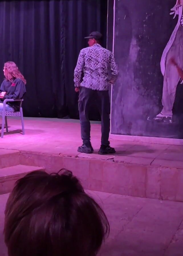 performance on a stage bathed in purple light. Several people are seated in chairs on the stage, seemingly acting as judges or audience members within the scene. Standing near them is a woman in a cropped top and pants. In the center, a man wearing a patterned shirt, dark pants, and a cap is walking and smiling. There is a large mural behind him, featuring a stylized man in a suit. In the foreground, the back of an audience member's head is visible, along with a glimpse of someone with a leopard print garment. The stage itself appears to be simple, with a slightly raised platform and basic backdrop.