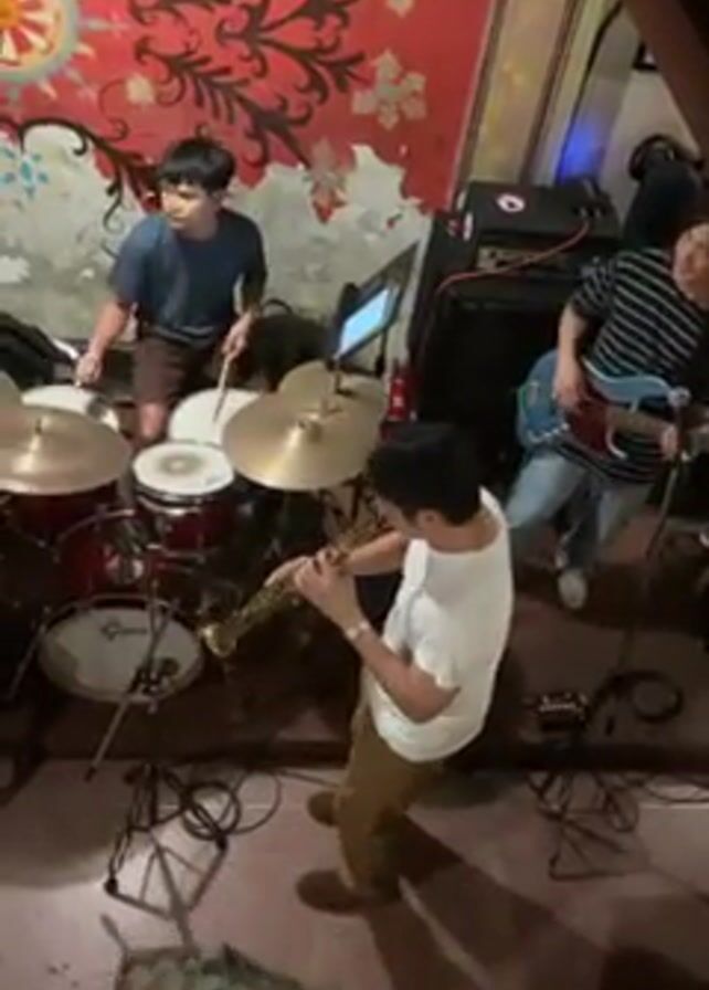 A low-angle, medium shot reveals a four-member band performing in what appears to be a club or bar. The drummer, wearing a blue shirt and brown shorts, is energetically playing on a red drum kit. A saxophone player, dressed in a white t-shirt and tan pants, is centered in the frame playing his instrument. To the right, a bassist in a striped shirt and jeans plays his electric guitar. The fourth person is at the bottom of the frame in camouflage pattern attire, appearing to be setting up equipment. The red walls behind them feature a large, patterned design with red flowers, adding to the room's ambiance. A black amp sits in the background.