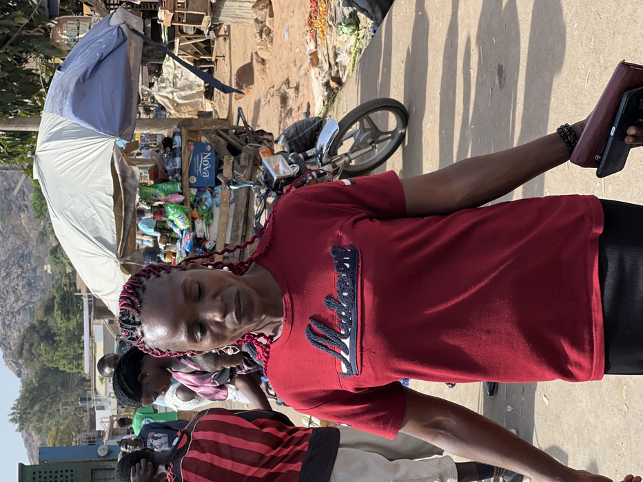 The image depicts an outdoor market scene in the city of Gwong, Nigeria, under clear daylight. In the foreground, a dark-skinned woman is centered, oriented slightly right and looking downwards. She has red-tinted braided hair, two teardrop-shaped white earrings, and wears a short-sleeved, deep red t-shirt with a prominent dark blue and white embroidered text logo on the chest. She also wears a dark skirt. Her left hand holds a dark-colored smartphone and a reddish-brown wallet. Behind her, to the left, several other individuals are partially visible, including a person in a red and black striped shirt facing away, and another with dark braids. To the right and slightly behind the main subject, a market stall is set up under a large, two-toned umbrella (light grey and blue). The stall, constructed from wooden crates, displays various packaged goods such as snacks and beverages, with some items labeled "NOVA." A silver-colored motorcycle is parked directly in front of this stall, facing left. The ground is a mix of dirt and uneven pavement. In the far background, a large, rocky mountain range is visible beneath a bright sky.