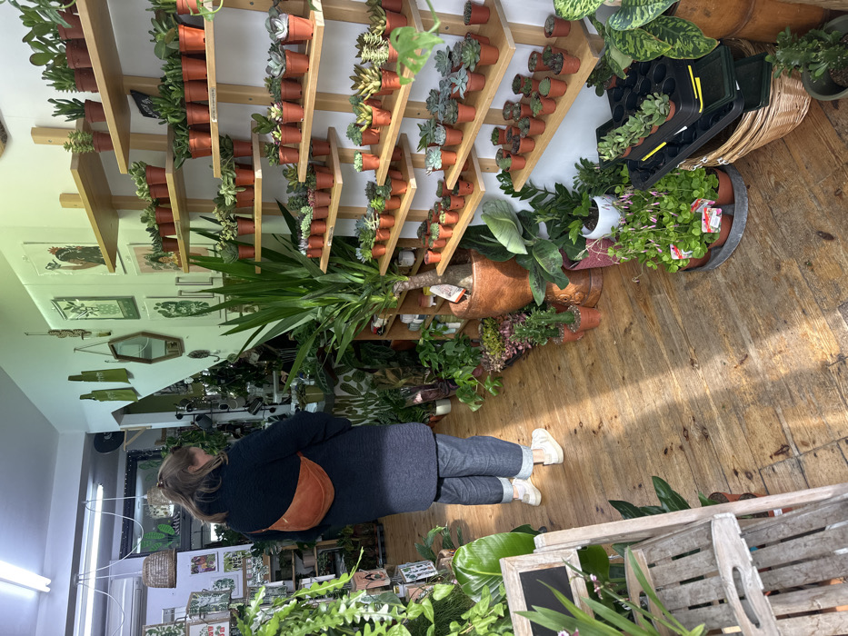 An interior view of a plant shop in Thanet, United Kingdom, shows one individual browsing amidst numerous plants