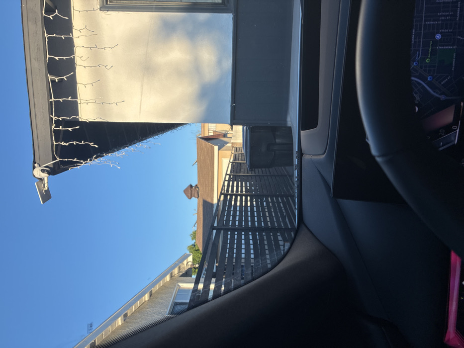The image depicts a residential scene in Sun Valley, Los Angeles, California, United States of America, observed from the interior of a vehicle. The foreground features a dark vehicle dashboard, a portion of the steering wheel, and a digital display screen showing a map interface. The map indicates streets such as Sulton Ave, Whitsett Ave, and Nordhoff Ave, along with "Sun Valley P.D." Through the vehicle's windshield, a clear blue sky is visible above residential structures. To the right, a building with a multi-layered facade features a dark grey lower section and a lighter, possibly stucco, upper section. Its dark eaves are adorned with unlit white icicle-style string lights, and a solar-powered security camera is mounted near the corner of the eaves. Adjacent to this building, two dark, wheeled waste bins are positioned. To the left, a portion of a lighter-colored residential building with a pitched roof is visible. A dark horizontal slat fence runs between the two foreground structures. In the background, behind the fence, a third building, likely a garage or shed, presents a brown pitched roof topped with a small, dark cupola or ventilation element. No individuals or active interactions are present in the frame. The scene is illuminated by natural daylight, indicating daytime conditions.