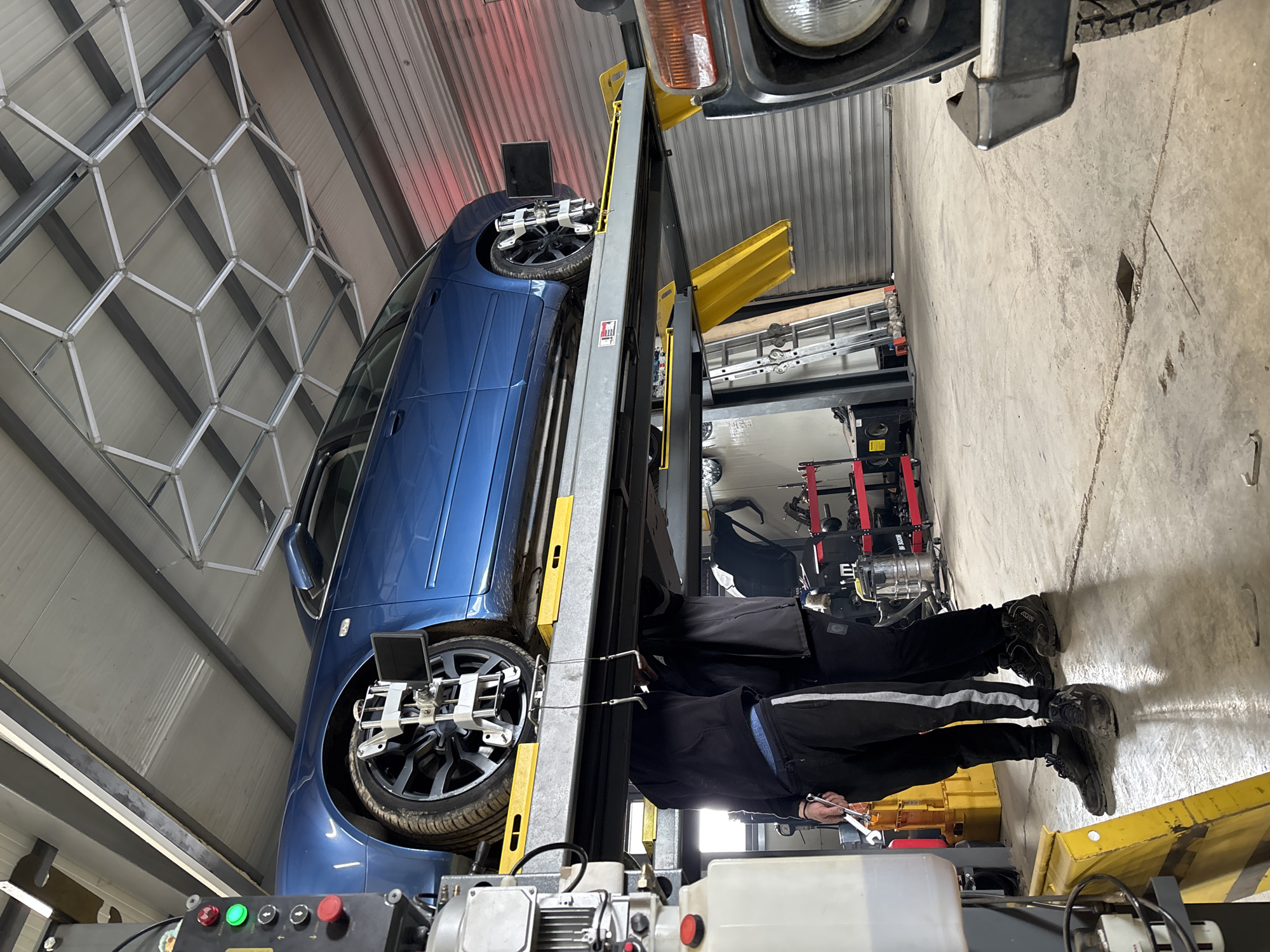 A blue car is suspended on a yellow and gray hydraulic car lift in an auto repair shop, potentially in Isperih, Bulgaria. A person, dressed in a dark jacket and dark track pants with a white stripe down the side, stands adjacent to the lift. The person appears to be working on the car, holding a wrench. Alignment equipment is attached to the wheels of the car. The shop has a metal roof structure and concrete floors. An additional vehicle, partially visible, is located at the top right of the frame.