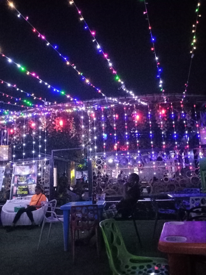 Outdoor restaurant at night is lit with colorful string lights. A woman in an orange shirt sits in a white chair on the left, near a poster. The restaurant's decor features a metallic wall with circular cutouts. Tables and chairs are scattered around, some occupied. Overall, the image conveys a lively and atmospheric dining scene.