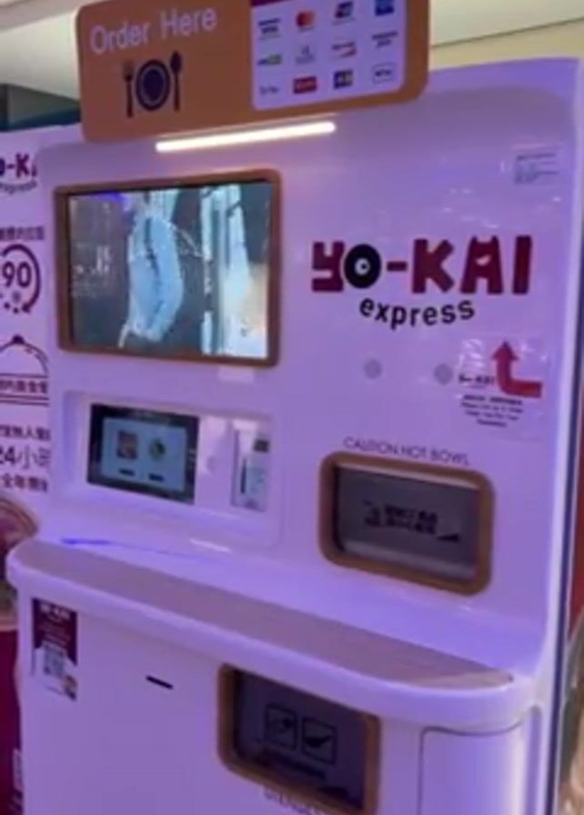 Yo-Kai Express ramen vending machine. The machine is white with wood-like trim and several screens. A large screen at the top shows a video of people making and enjoying ramen. Below this is a touchscreen for ordering. To the right of the touchscreen is a card reader and below this a slot labeled "Utensils". Above the utensils slot is another slot labeled "Caution Hot Bowl". The machine has signs with the Yo-Kai Express logo and payment options. The machine is likely located in a public space, like a mall or airport.