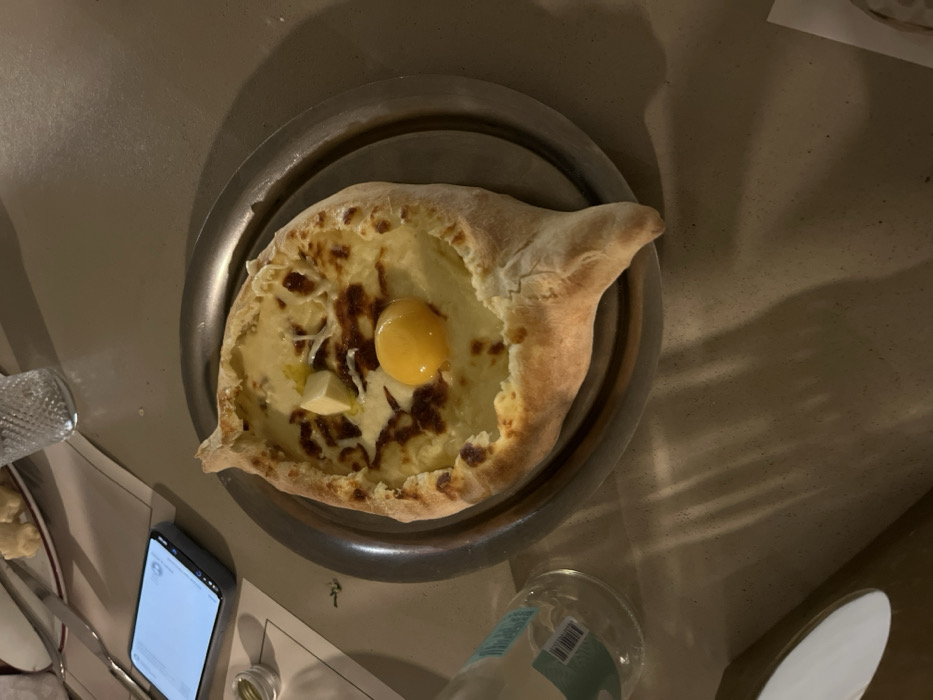 - "A boat-shaped Khachapuri Adjaruli is presented on a round, silver-colored metal plate, positioned centrally on a light beige or tan table surface" by FM-jiFXL2, licensed under CC BY 4.0
