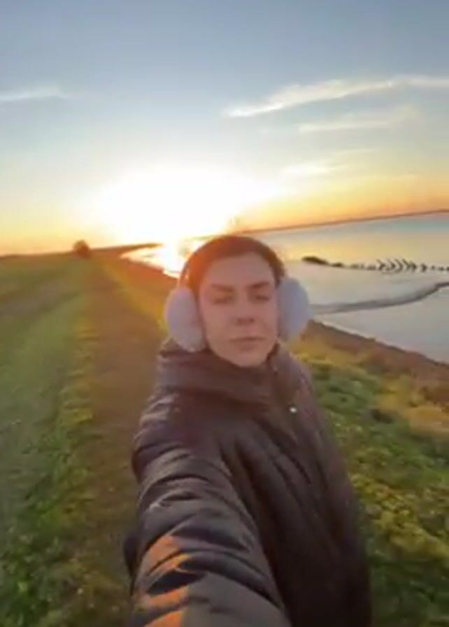 The video captures a woman's first-person perspective as she walks along a grassy path by the sea at sunset