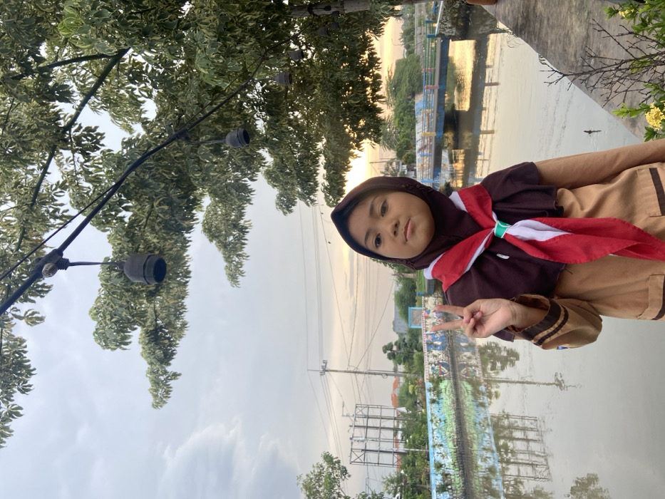 An individual, gender indeterminate but appearing female, stands centrally in an outdoor urban or semi-urban environment in Kalitengah, Indonesia. They are dressed in a light brown uniform top, a dark brown neckerchief, a red and white tied scarf, and a dark brown hijab covering the head and neck. The individual faces forward, looking directly at the viewer, with a neutral expression and holds their right hand up, displaying a V-sign. The background features a narrow waterway, likely a canal or river, reflecting the sky and distant light. The near bank includes a concrete or stone retaining wall. On the far bank, a wall adorned with a colorful mural is visible, followed by a small bridge with blue and white railings spanning the water. Further in the distance, a large metal billboard structure, utility poles, and various buildings are present under a partly cloudy sky. Overhead, a string of bare light sockets hangs from a wire, partially obscured by tree branches with variegated green and white leaves. In the lower right foreground, a plant with small yellow flowers is partially visible. The scene is illuminated by natural light, with a warm, golden glow emanating from the horizon, indicative of either sunrise or sunset.
