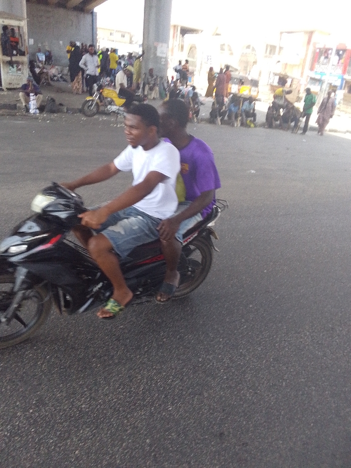 Two young men are riding a black motorcycle down a paved road. The driver wears a white t-shirt, denim shorts, and sandals. The passenger behind him wears a purple shirt and sandals. In the background, an overpass looms with crowds of people gathered underneath. Motorcycles and three-wheeled vehicles are parked along the roadside near the crowd. Buildings and structures are visible in the distance, suggesting an urban environment.