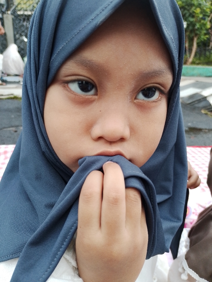 A close-up image shows a young individual, likely female, with light brown skin, wearing a dark teal headscarf (hijab) and a white garment underneath