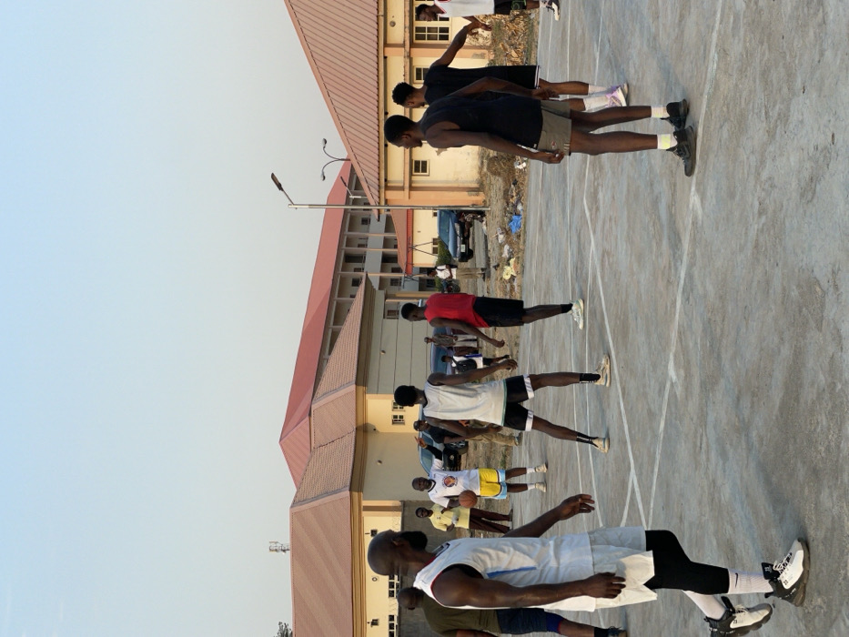 A group of young men are gathered on a concrete basketball court. They are dressed in athletic wear, with some wearing jerseys. A building with a red roof is in the background, and the sky is clear. The image appears to be taken at ground level. The men are standing and seem to be engaged in some form of practice or a casual game.