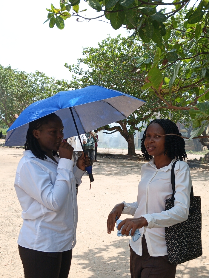 This image depicts an outdoor, unpaved area in Ihiagwa, Nigeria, under daylight conditions. Two adult females stand in the foreground, partially shaded by tree foliage. The female on the left, with dark skin and dark braided hair, wears a long-sleeved white button-up shirt and dark trousers. She holds an open blue umbrella with a silver underside in her right hand, positioned above her head. Her left hand is raised to her mouth, possibly holding an object or engaged in a gesture of speaking. The female on the right, with dark skin and dark braided hair styled with curls at the ends, wears a long-sleeved white collared shirt and dark trousers. She carries a black tote bag with a repeating light-colored geometric pattern on her left shoulder. Her right hand holds a light blue folded cloth. She is looking towards the left, appearing to interact with the first female. The ground is unpaved dirt. Large trees with green leaves are visible, extending into the upper frame and forming part of the background. A bright, clear sky is visible above. In the blurred mid-ground, a faint plume of light-colored smoke or dust is present, with indistinct figures and structures in the distant background.