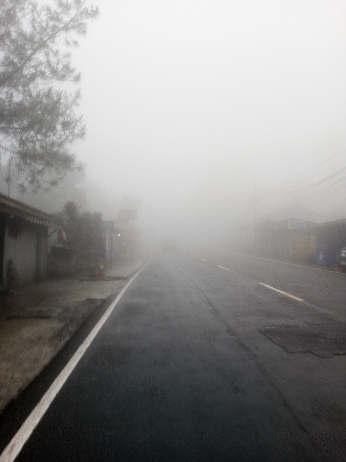 The image depicts a foggy road scene in Dawathang_Dorjibi_ Kashingtsawa, Bhutan, characterized by extremely low visibility due to dense white fog