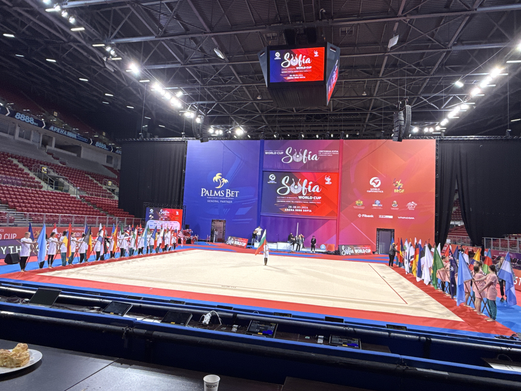 The image depicts the interior of Arena 8888, also known as Arena Armeec, in Sofia, Bulgaria, during a Rhythmic Gymnastics World Cup event scheduled for March 28-30, 2024