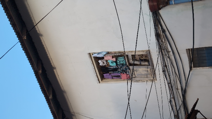 The scene depicts a segment of a white-painted building facade under a clear blue sky in the city of Zanzibar, Tanzania. A dark corrugated metal roofline, supported by exposed wooden beams, is visible at the top. A prominent, weathered wooden window frame with significant paint peeling is centrally located in the upper wall. Inside this window opening, multiple pieces of clothing, including purple, black, light blue, pink, and white garments, are suspended, suggesting they are drying. A dense, disorganized network of black electrical or communication wires spans horizontally across the middle of the facade. Below these wires, a smaller, darker window opening with a blue panel or shutter is partially visible. On the far right side of the building, a blue downspout with a rusted brown connection piece is affixed to the wall. No individuals are visible.