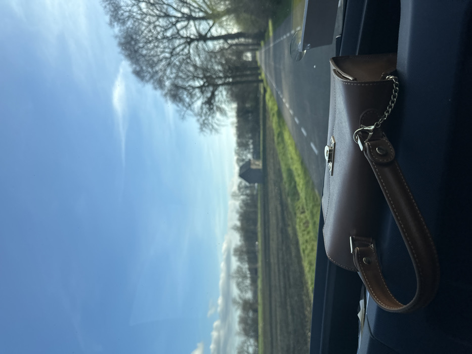 The scene is captured from inside a vehicle, looking outwards over a rural landscape in Sint Anthonis, Netherlands. In the immediate foreground, a brown leather handbag with a top handle, metallic clasp, and a small metallic chain lies on a dark, non-reflective surface, likely a dashboard. A suction-cup mounted object is partially visible on the far right, affixed to the windshield. Beyond the vehicle's interior, a paved road with white dashed lines extends linearly into the distance. To the left of the road, a strip of green grass separates it from a large, dark-brown tilled field. Further left in the mid-distance within the field, a small, dark, gabled structure, possibly a shed or barn, is discernible. Along the right side of the road, a dense row of tall, bare deciduous trees forms an avenue. The sky above is clear blue with sparse, wispy white clouds, indicating daylight conditions. No individuals are visible.
