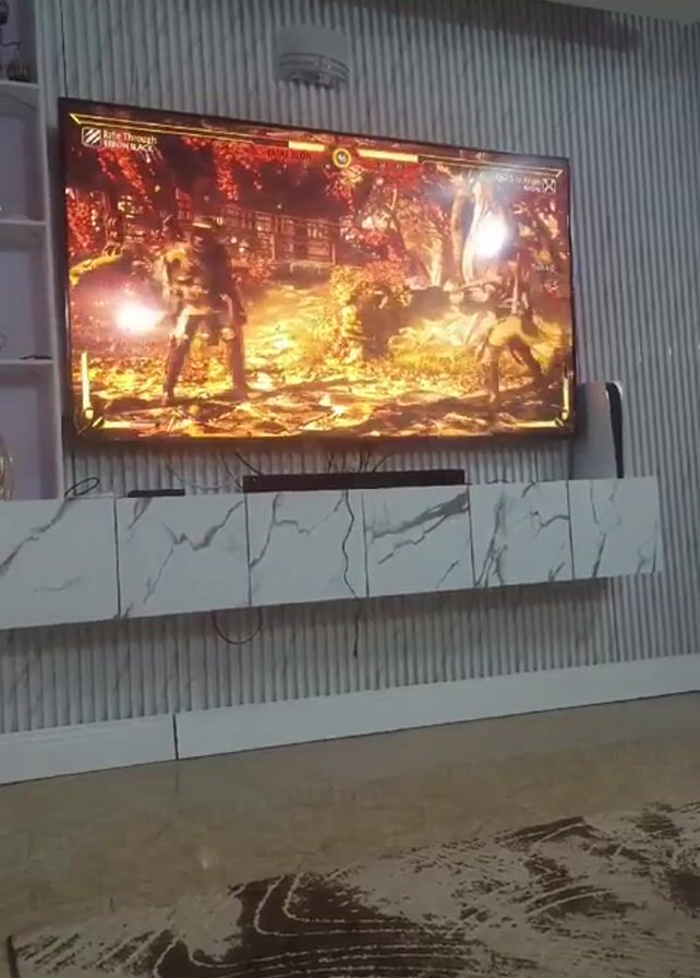 living room with a large flat-screen TV mounted on the wall. A fighting video game is playing on the TV. A long, low white cabinet with a marble pattern sits under the TV. The wall is covered in a vertically striped material. There is a beige rug on the floor with a dark brown swirling pattern. A white shelf unit is visible on the left side of the frame. Someone is playing the game, but they are not visible in the video. The audio contains sound effects from the game and someone speaking in another language.