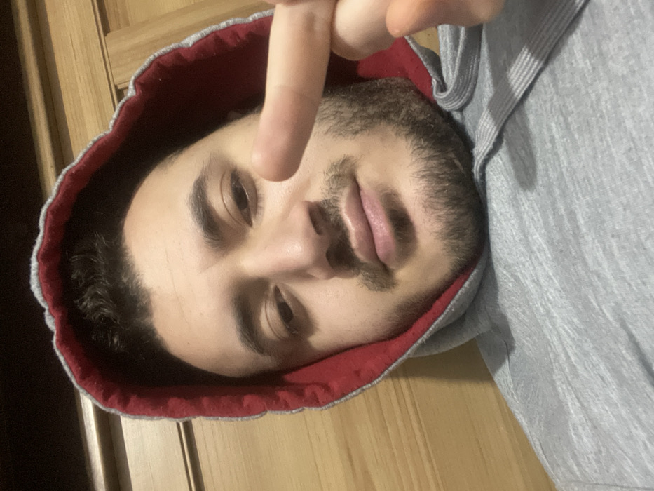A man with a beard and dark hair is wearing a gray hoodie with a red lining. He's holding one finger up to the camera, possibly in a joking manner. The image is slightly tilted, with the man's face angled towards the right. The background appears to be a wooden door or wall. The lighting is soft, highlighting the features of the man's face.