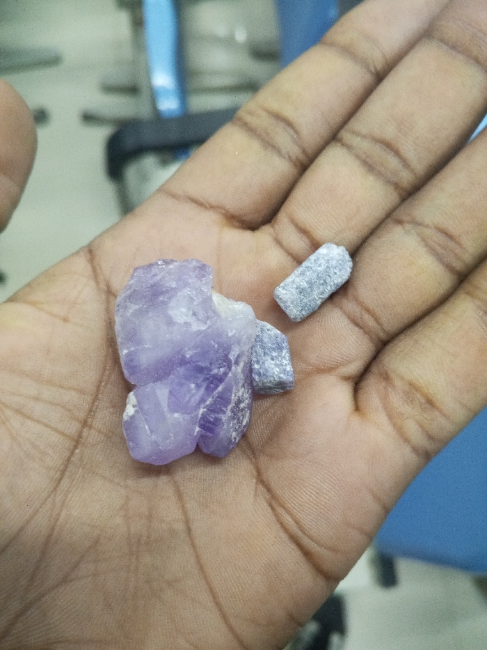 A dark-skinned hand holds a cluster of raw amethyst crystals, exhibiting a light purple hue with jagged edges. A small, rectangular piece of gray stone rests beside the amethyst, also displaying a rough texture. The hand is positioned against a blurred background of office furniture and blue upholstery.