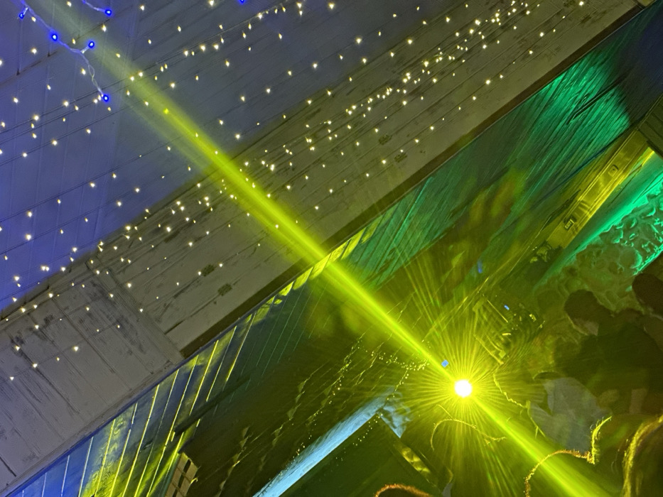 This image depicts an indoor scene within the city of Cheshnegirovo, Bulgaria, characterized by intense artificial illumination. The lower-left and central-left portions of the frame contain the indistinct silhouettes of multiple individuals, indicating a gathering or audience. A prominent, bright circular yellow-green light source, likely a projector or laser, emits numerous radial beams, creating a starburst effect and strong diagonal light rays across the scene. These beams interact with the upper architectural elements, which consist of angled, textured, or paneled surfaces, possibly a ceiling or upper walls, reflecting the green light. Numerous small, warm-white LED string lights are suspended across these upper surfaces, particularly in the upper-right section, where a blue light wash is also visible. The overall environment is dynamic and brightly lit, with a strong emphasis on light and shadow, suggesting an event.