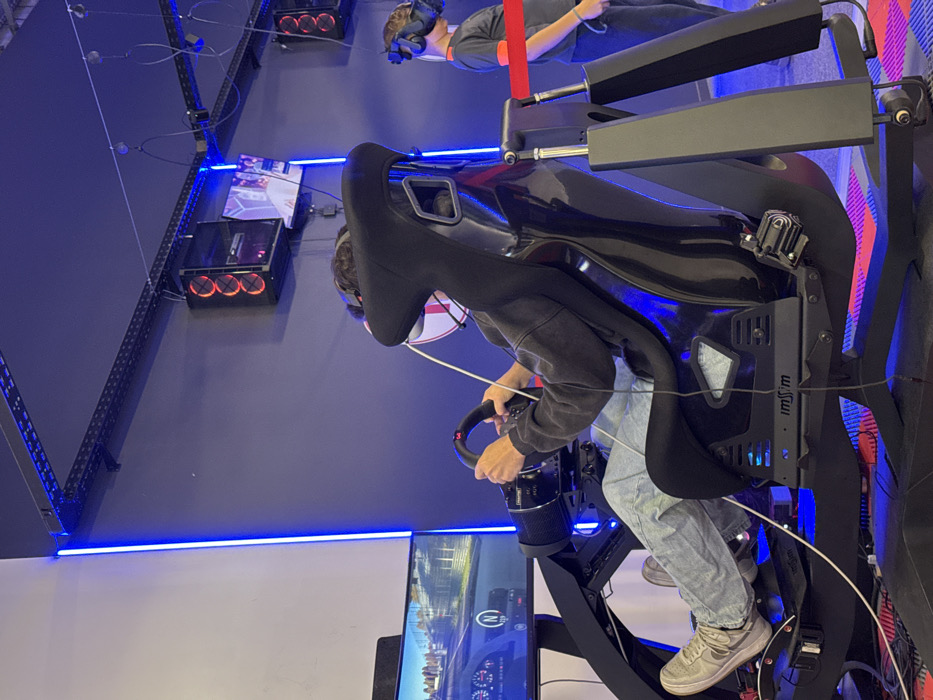 Inside an indoor entertainment facility in Reichstett, France, a person is seated within a black racing simulator rig