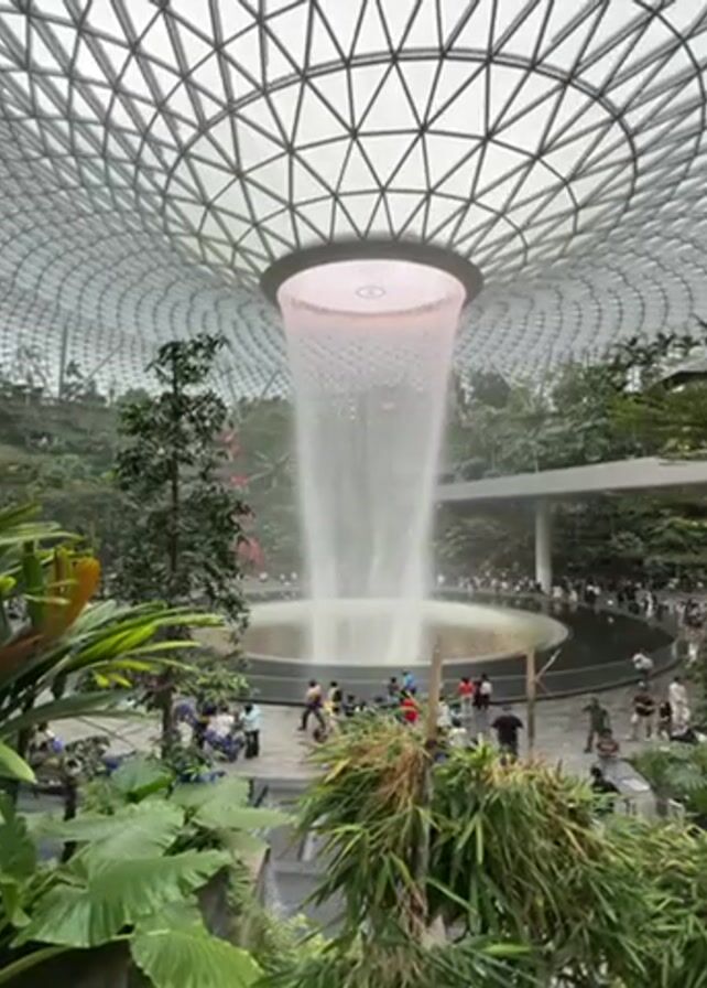 high-angle, still shot of the Rain Vortex waterfall inside the Jewel Changi Airport in Singapore. The water falls from a circular opening in the center of the complex geometric glass dome overhead. Lush, tropical plants surround the base of the waterfall and are interspersed throughout the building. People walk around the base of the waterfall and on a bridge in the background. The waterfall cascades into a circular pool.