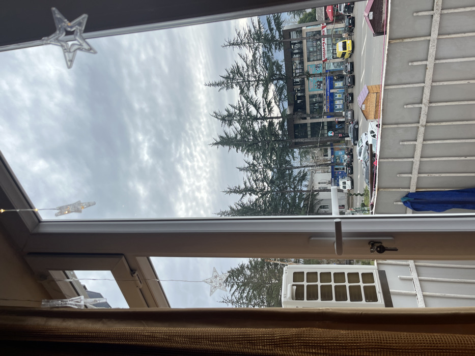 The image captures an exterior view from a window or balcony in Lanchkhuti, Georgia, on an overcast day. In the immediate foreground, a brown textured curtain partially frames the left side. A white uPVC window or balcony door frame occupies the center, featuring a silver handle and a key inserted into its lock mechanism. Three translucent, star-shaped decorative elements are suspended from the top of the window frame. An external white air conditioning unit is visible mounted outside the window on the far left. A white metal balcony railing runs across the bottom of the frame, with a blue towel draped over its upper bar on the left. Beyond the railing, a paved street or square is visible, populated with various parked vehicles including black and grey passenger cars, a white van, and a yellow minivan. Two small wooden structures with distinct colored roofs (one purple, one red) are situated on the ground level behind the railing, near the street. A prominent multi-story modern commercial building with glass facades and multiple storefronts (displaying signs such as "LIBRE" and "AVSI") stands across the street. A line of tall, dark green coniferous trees are positioned in front of and to the sides of this building, their tops reaching towards the cloudy sky. The sky itself is uniformly overcast with visible cloud formations. No individuals are clearly depicted engaging in specific actions.
