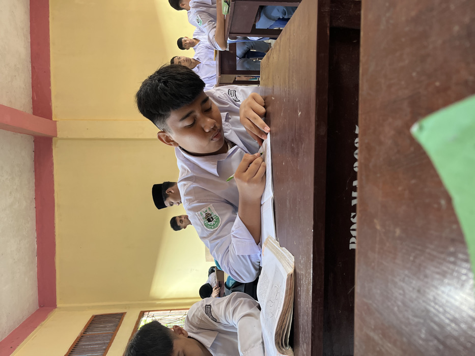 A classroom scene shows students in uniform seated at desks. The primary focus is on a boy concentrating while writing on a piece of paper. He wears a white shirt with a patch on the sleeve. Other students are visible in the background, some looking ahead, suggesting they are also engaged in an activity like taking a test. There's a book with ornate designs on its cover at the corner of a desk. The classroom has a yellow wall and brown desks.