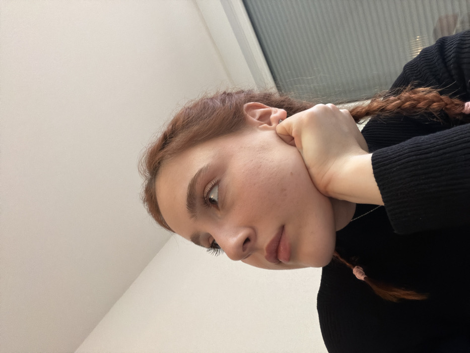 An indoor scene depicts an individual, appearing to be a young female, from the upper torso upwards. The person has fair skin and reddish-brown hair styled into two braids, one of which is visible and secured with a light pink elastic band. She is wearing a black long-sleeved ribbed top and a thin silver-colored necklace. Her left hand is positioned under her chin, supporting her jawline. The individual's head is tilted slightly, and her gaze is directed upwards and to the left of the frame. A small, reflective earring is visible in her right ear. The background consists of a plain white ceiling and wall, with a window featuring horizontal blinds partially visible on the right side. The specific location within Eschau, France, is not determinable from the image.