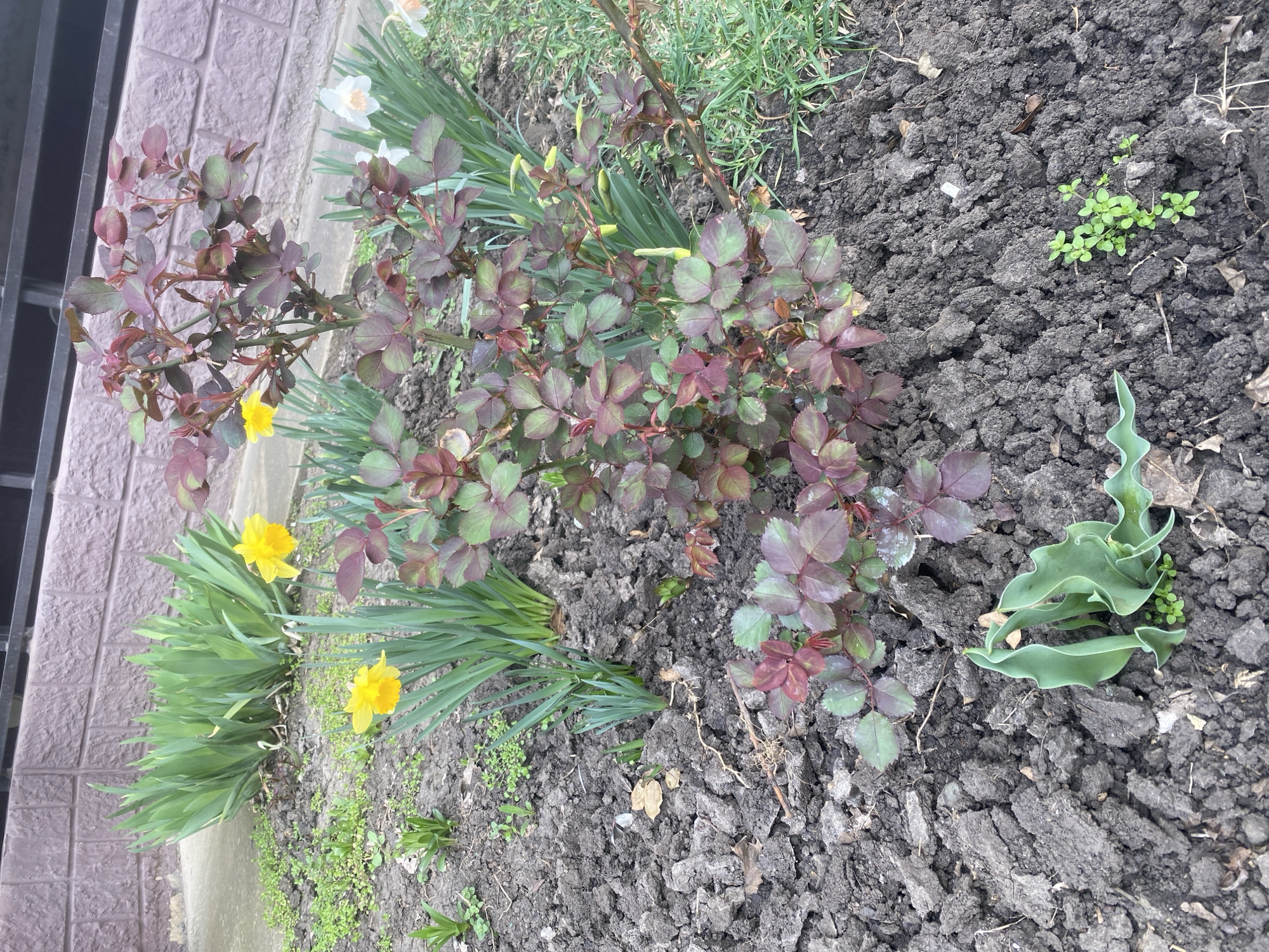 This image depicts an outdoor garden bed located in Krasnodar, Russia, adjacent to a building structure. The garden bed features dark brown, clumpy soil that appears cultivated. A small rose bush with developing reddish-green foliage is centrally prominent. To the left, two yellow daffodils are in full bloom, while on the right, several white daffodils are present, with at least one in bloom and others showing closed buds. Along the back edge of the garden, a dense clump of tall, green, blade-like foliage, consistent with irises, grows. Sparse patches of small green weeds are scattered throughout the soil. In the lower left foreground, a single, curled green plant, possibly a tulip, emerges from the ground. A grey concrete path runs along the left and upper periphery of the garden bed. In the background, a building wall constructed of reddish-brown rectangular bricks or tiles is visible, topped by a dark-colored metal railing or window frame. No individuals are depicted in the scene.
