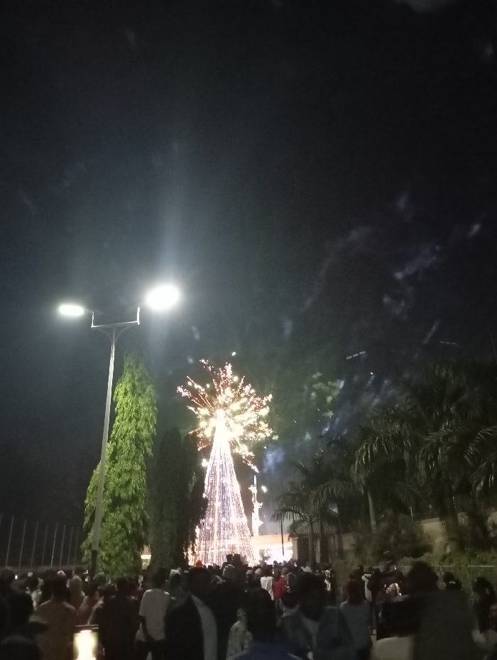 A nighttime gathering of people centers around a brightly lit Christmas tree with fireworks exploding above. A tall streetlight illuminates the left side of the scene, contrasting with the dark sky where wisps of smoke linger from the fireworks. Trees flank the edges, with palm trees on the right adding to the setting. The crowd appears dense, obscuring details of individual faces and attire.