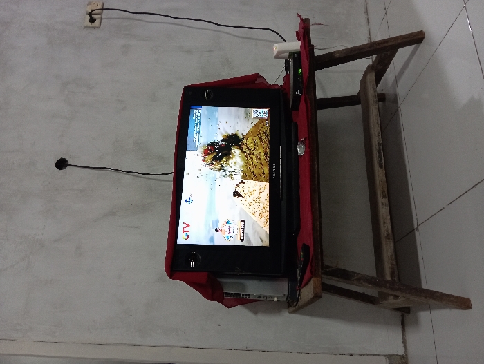 The image depicts an indoor scene in Bulukandang, Indonesia. A black CRT television, partially draped with a red fabric, rests on a rustic, dark brown wooden table featuring a lower shelf. The television screen displays content from "GTV," showing an animated or graphical scene with a character on the left, a large explosion or volcanic eruption in the center, and a split-screen effect with a textured background. A black remote control, a black electronic set-top box with an illuminated green LED, and a white cylindrical object (possibly a candle) are positioned on the table to the right of the television. The background consists of a light grey, textured wall. A black electrical cord extends from a white wall outlet located high on the right side of the wall, leading downwards out of frame. Another thin black cable, possibly an antenna wire, protrudes from a small hole in the wall above the television. The floor is covered with light-colored tiles. No individuals are visible in the scene.