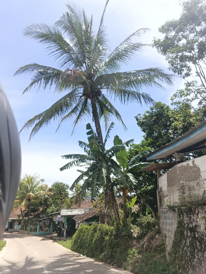 - "A roadside scene shows a tall coconut palm tree dominating the view, with ripening coconuts clustered near its crown" by FM-3eOqD3, licensed under CC BY 4.0