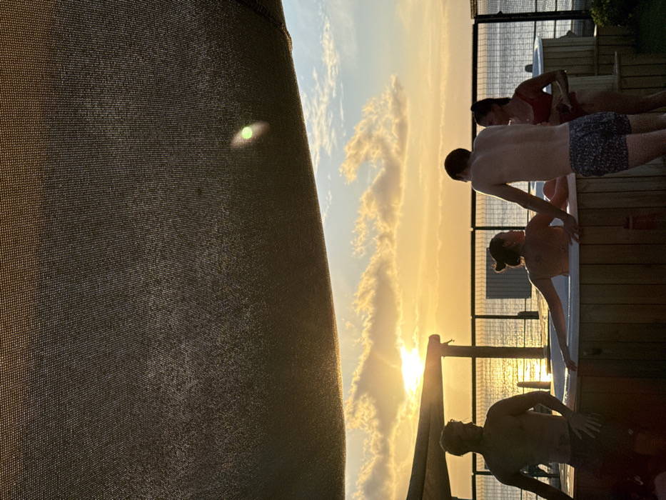 A low-angle shot of a rooftop or balcony view with three people in a hot tub at sunset